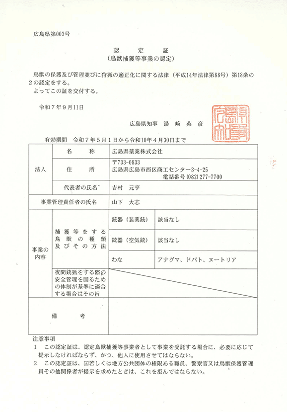 私たちは、「鳥獣の保護及び管理並びに狩猟の適正化に関する法律」に基づき、広島県知事より「認定鳥獣捕獲等事業者」の認定を取得しています。